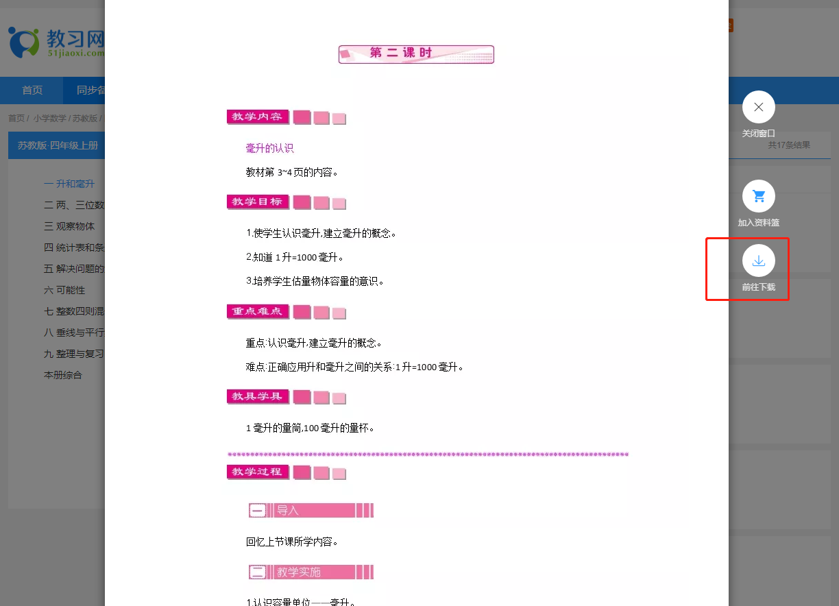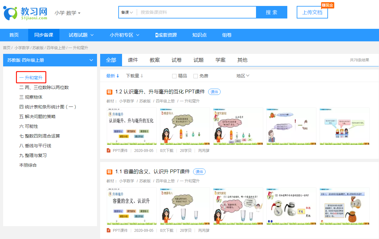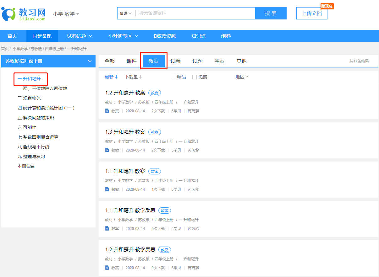 四年级的数学老师想要下载同步教案应该去哪里下载呢?今天小编手把手教学,下面,我以找苏教版数学四年级上册《升和毫升》同步教案为例,给大家做详细介绍。