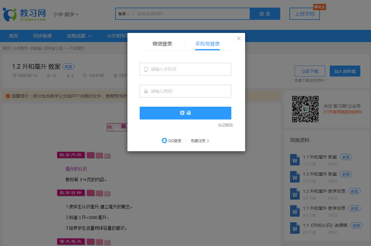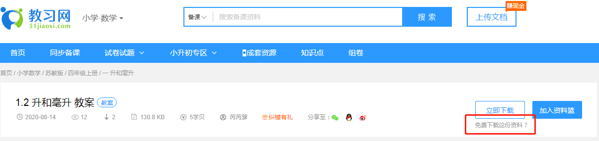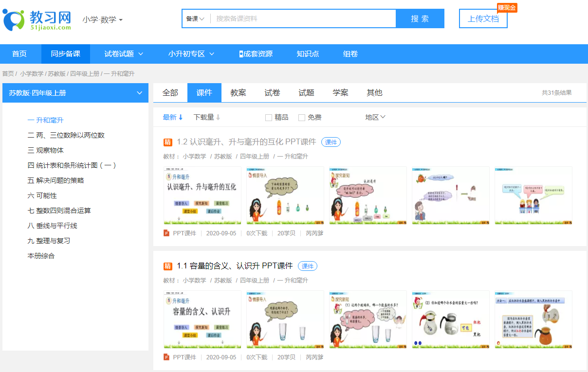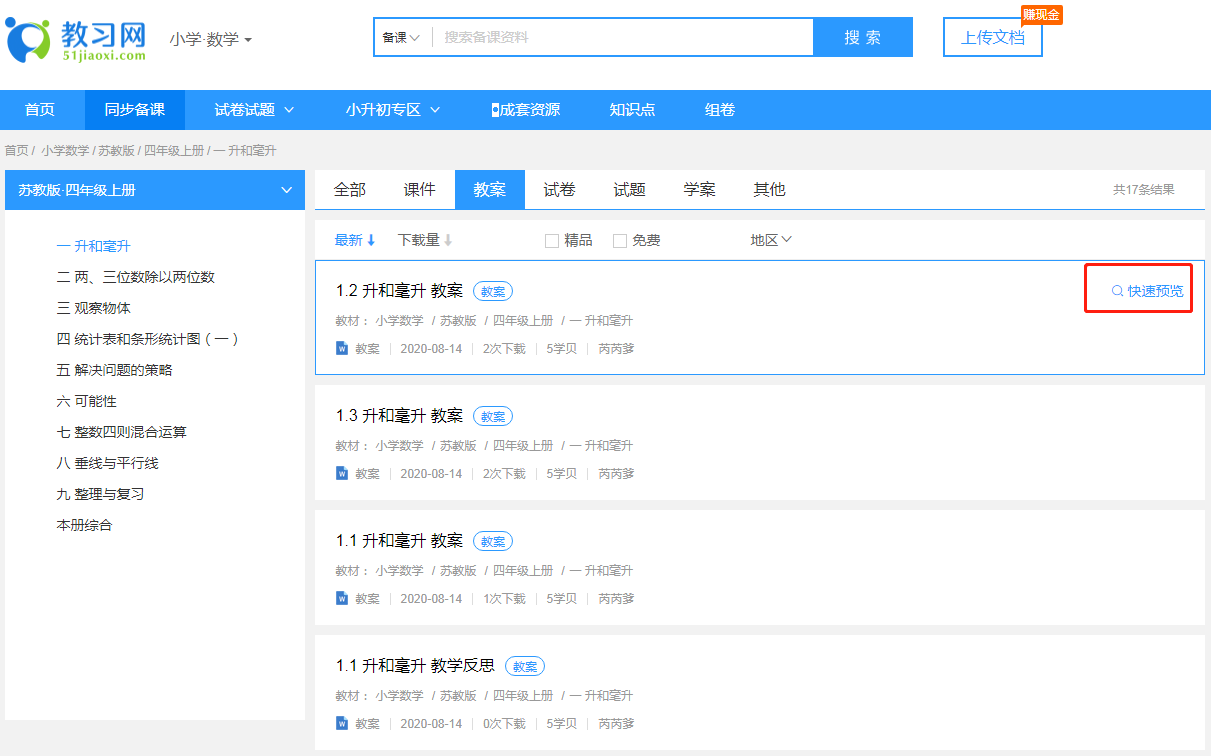 四年级的数学老师想要下载同步教案应该去哪里下载呢?今天小编手把手教学,下面,我以找苏教版数学四年级上册《升和毫升》同步教案为例,给大家做详细介绍。