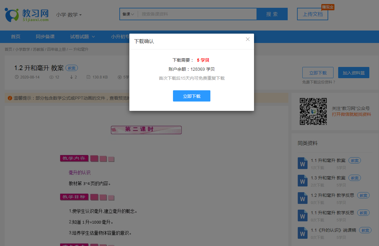 选择好章节后,你会注意到右侧的资料已经全部切换为相关章节的资料了。因为我需要同步教案,所以在上方的资料类型菜单,我直接选择【教案】。下方将筛选出《升和毫升》的所有教案。