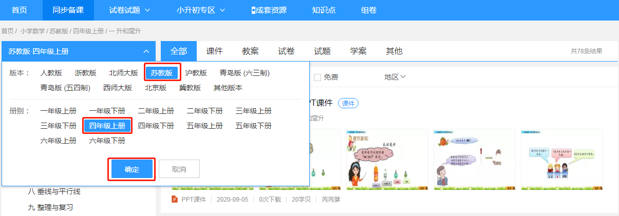 这时候,把鼠标移动到版本年级这里,点击它,选择你要的版本年级。我这里选择苏教版数学四年级上册